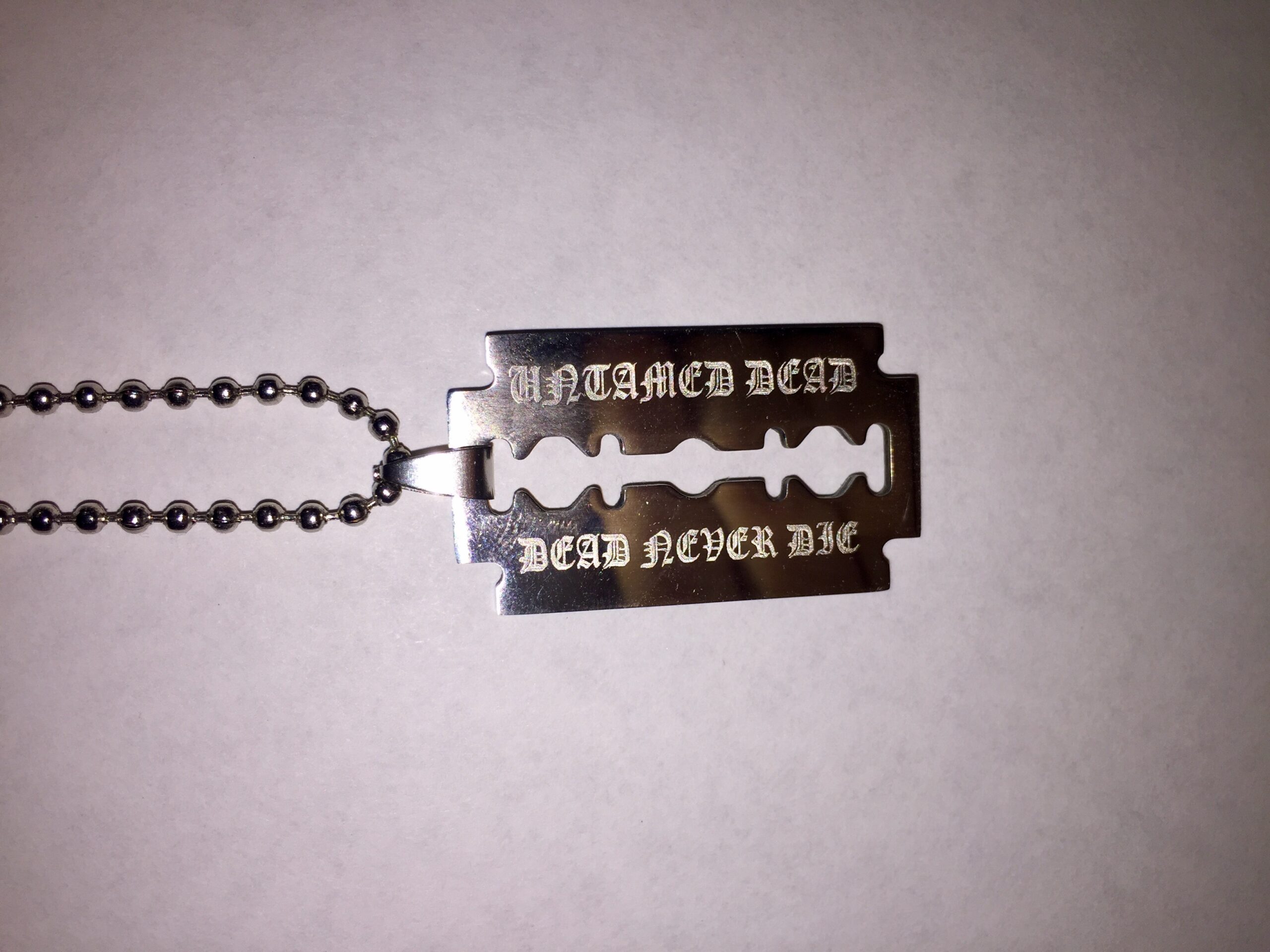 Well crafted razor blade engraved with the inscription: “Untamed Dead,” and “Dead Never Die.”